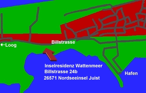![]() Nach Ankunft im Hafen gehen sie ca. 15 Minuten in westlicher Richtung zum Ortsteil Loog; sie kommen automatisch auf die Billstraße. Die Wohnung befindet sich im Ergeschoss. Treppensteigen bleibt ihnen erspart. Die Wohnung ist hell, freundlich und sonnendurchflutet.